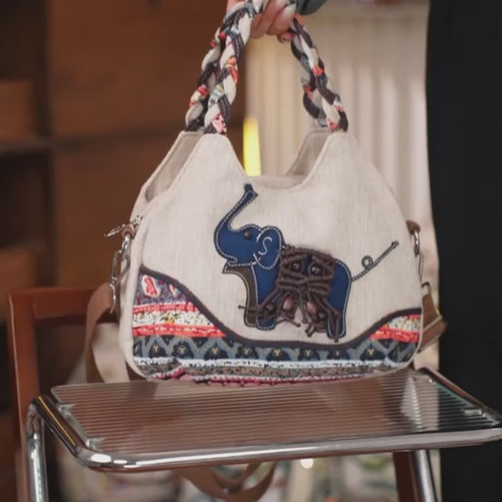 Medium Handmade Woven Elephant Fabric Handbag – Single Shoulder & Crossbody Bag with Multiple Pockets MH005