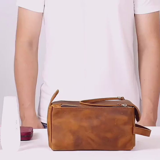 This vintage multi-functional men’s toiletry bag is crafted from genuine Crazy Horse leather, known for its rugged texture, durability, and unique aging character. Designed for travelers and everyday use, it offers large capacity storage to keep toiletries, grooming tools, and personal essentials neatly organized.